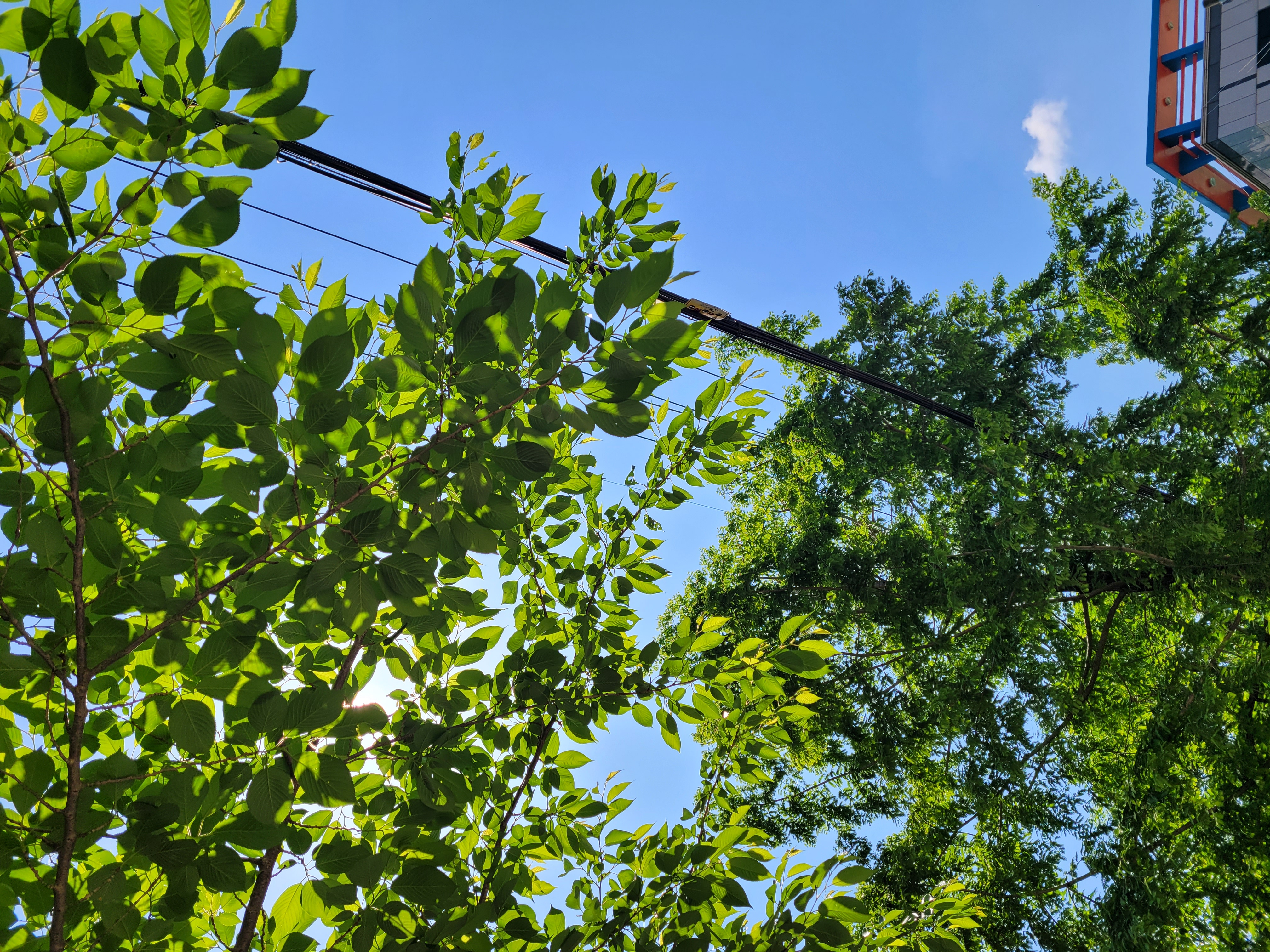 산책길 사진인데 뭔가 해가 쨍한 게 느껴지죠. 사진을 찍는다는 이유로 덕분에 하늘도 봤어요. 파란 하늘 흰구름 초록 나뭇잎.